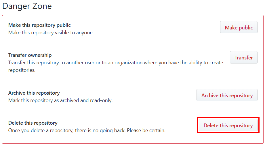 3. 스크롤을 밑으로 쭉 내리면 Danger Zone이 나옵니다. 여기서 Delete this repository 버튼을 클릭합니다.