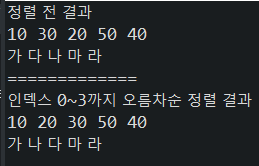 System.out.println("인덱스 0~3까지 오름차순 정렬 결과");