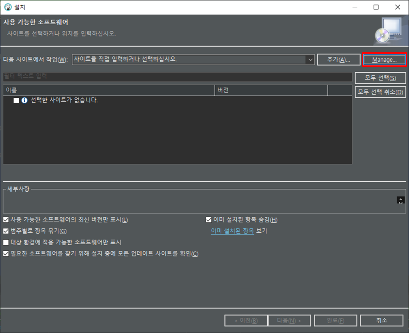 ▼ 설치 팝업창에서 "Manage" 버튼을 클릭합니다.
