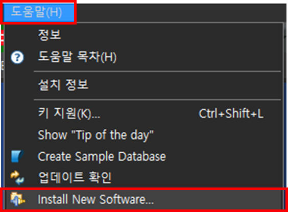 ▼ DBeaver 상단의 도움말 > Install New Software를 클릭합니다.