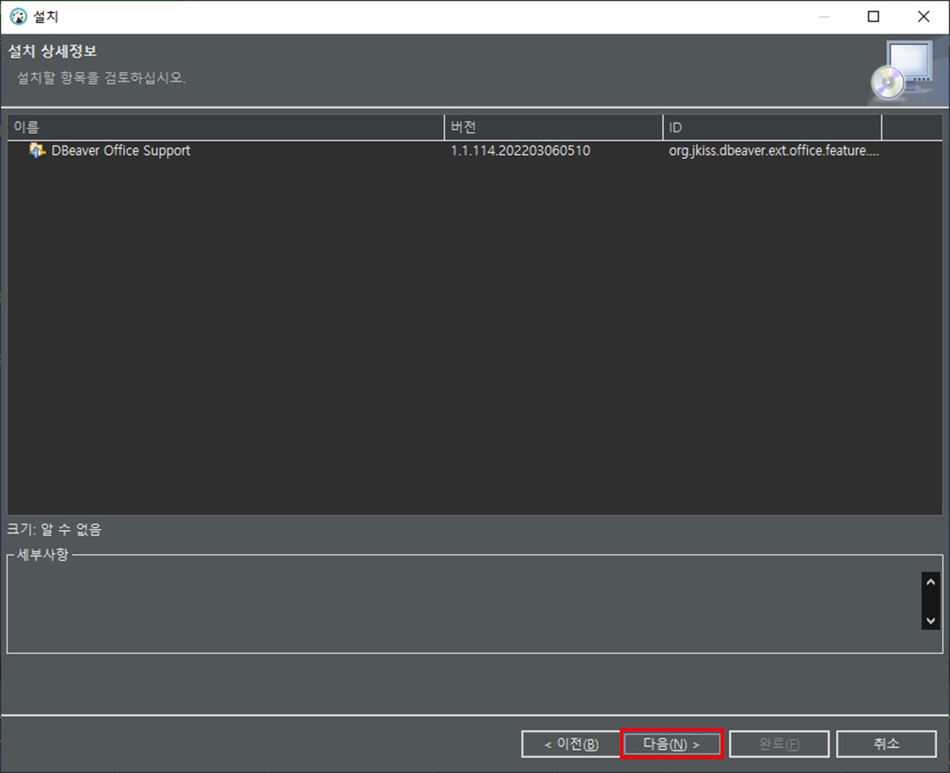 ▼ 설치 상세정보를 확인 후 "다음" 버튼을 클릭합니다.