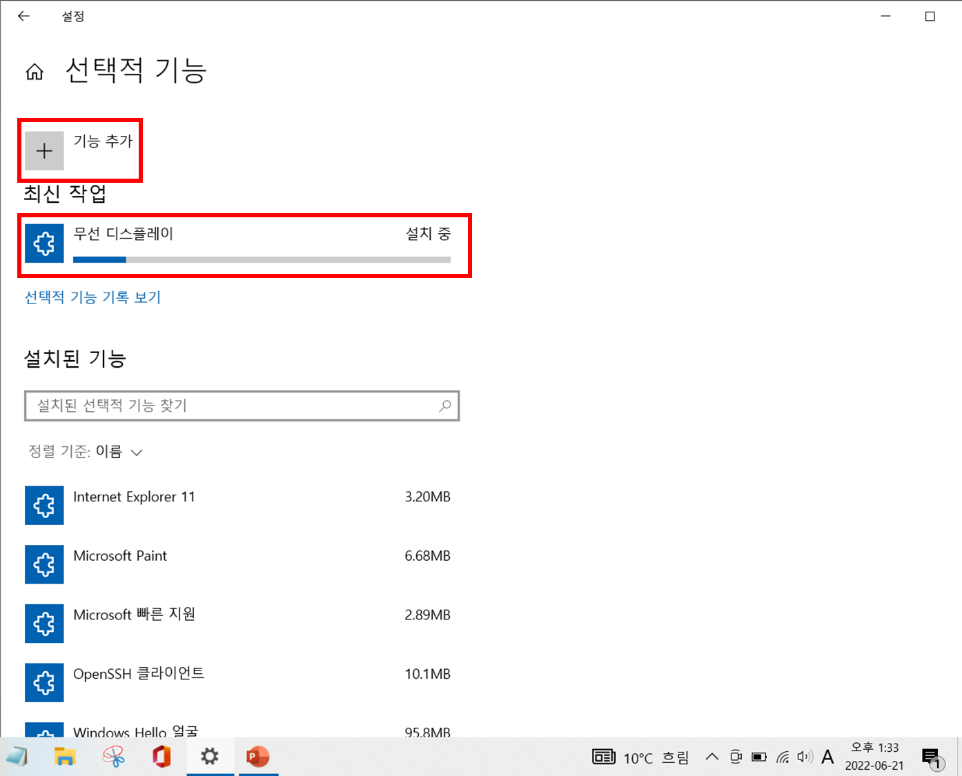 - 선택적 기능 설정 창에서 '기능 추가'를 눌러서 ‘무선 디스플레이’를 찾아 설치하여 준 후 다시 진행합니다.