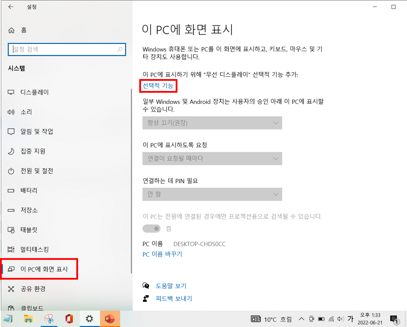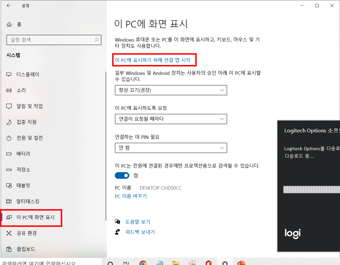 - '설정 > 시스템 > 이 PC에 화면 표시' 탭에서 이 PC에 표시하기 위해 연결 앱 시작을 클릭합니다.
