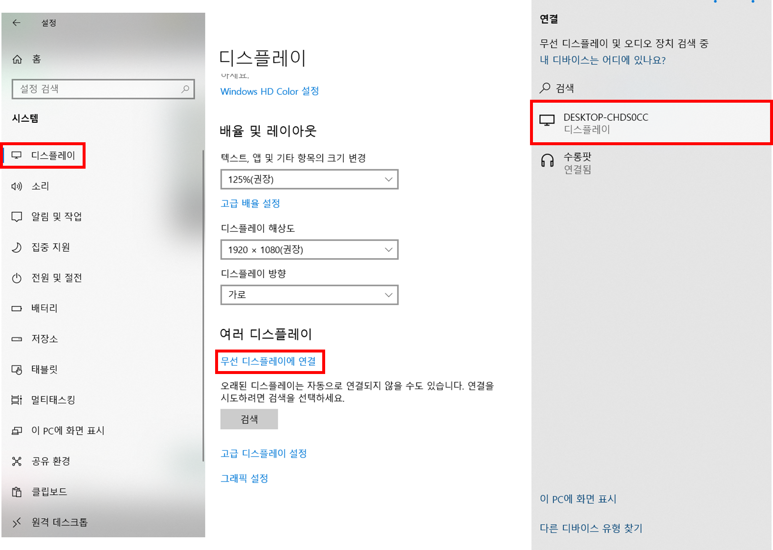 - '설정 > 시스템 > 디스플레이' 탭에서 무선 디스플레이에 연결을 클릭한 뒤, 노트북 2의 이름을 찾아 클릭합니다.