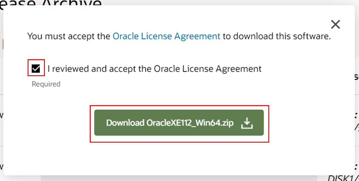 약관에 동의 후 Download OracleXE112_Win64.zip 버튼을 클릭하여 다운로드를 진행합니다.
