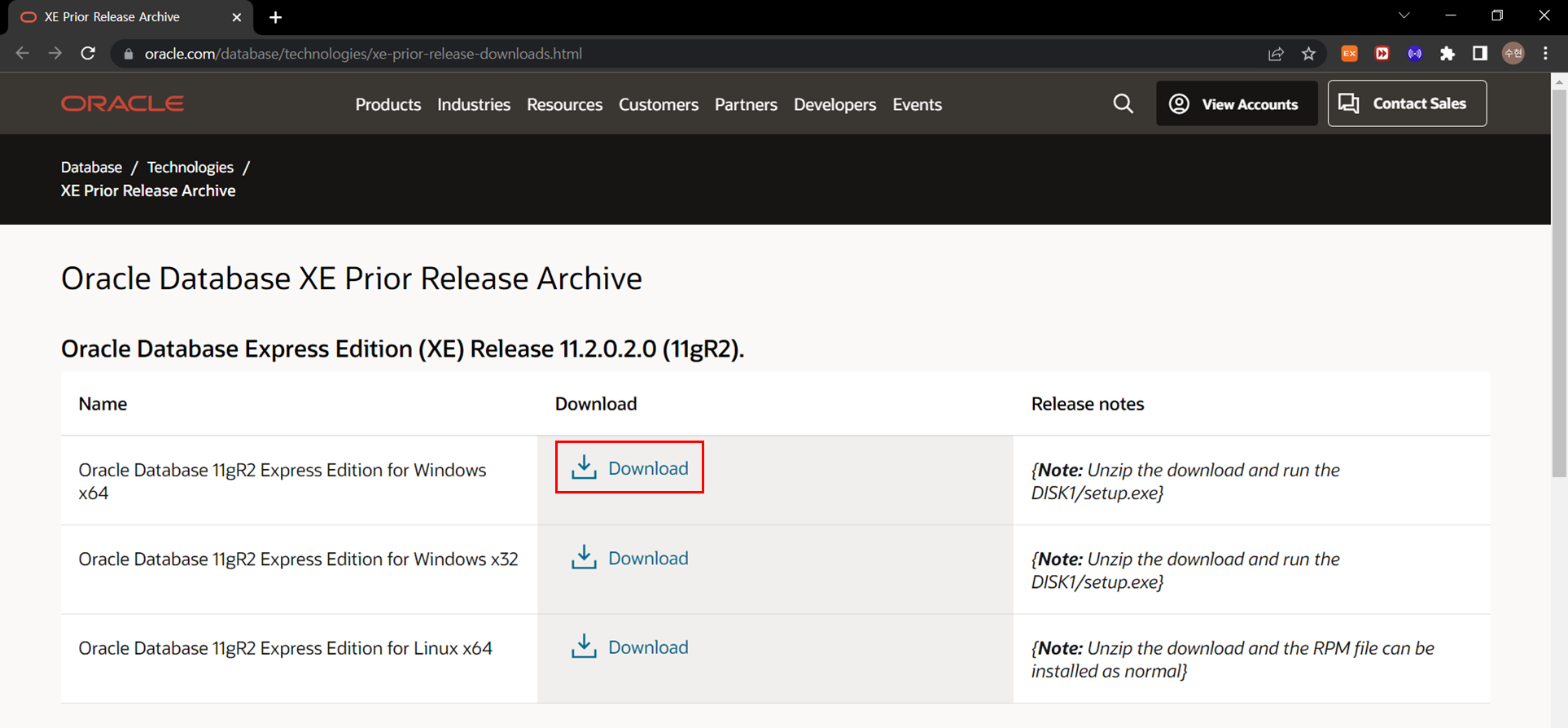 Oracle Database 11gR2 Express Edition for Windows x64 > Download 버튼을 클릭합니다.