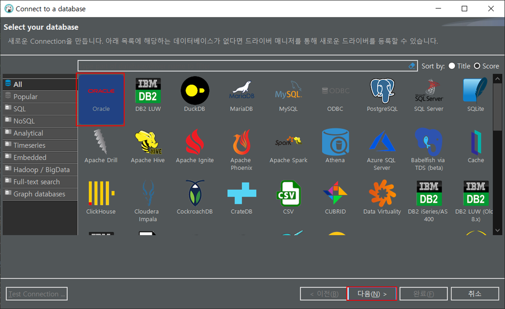 Oracle 데이터 베이스를 선택 후 '다음' 버튼을 클릭합니다.