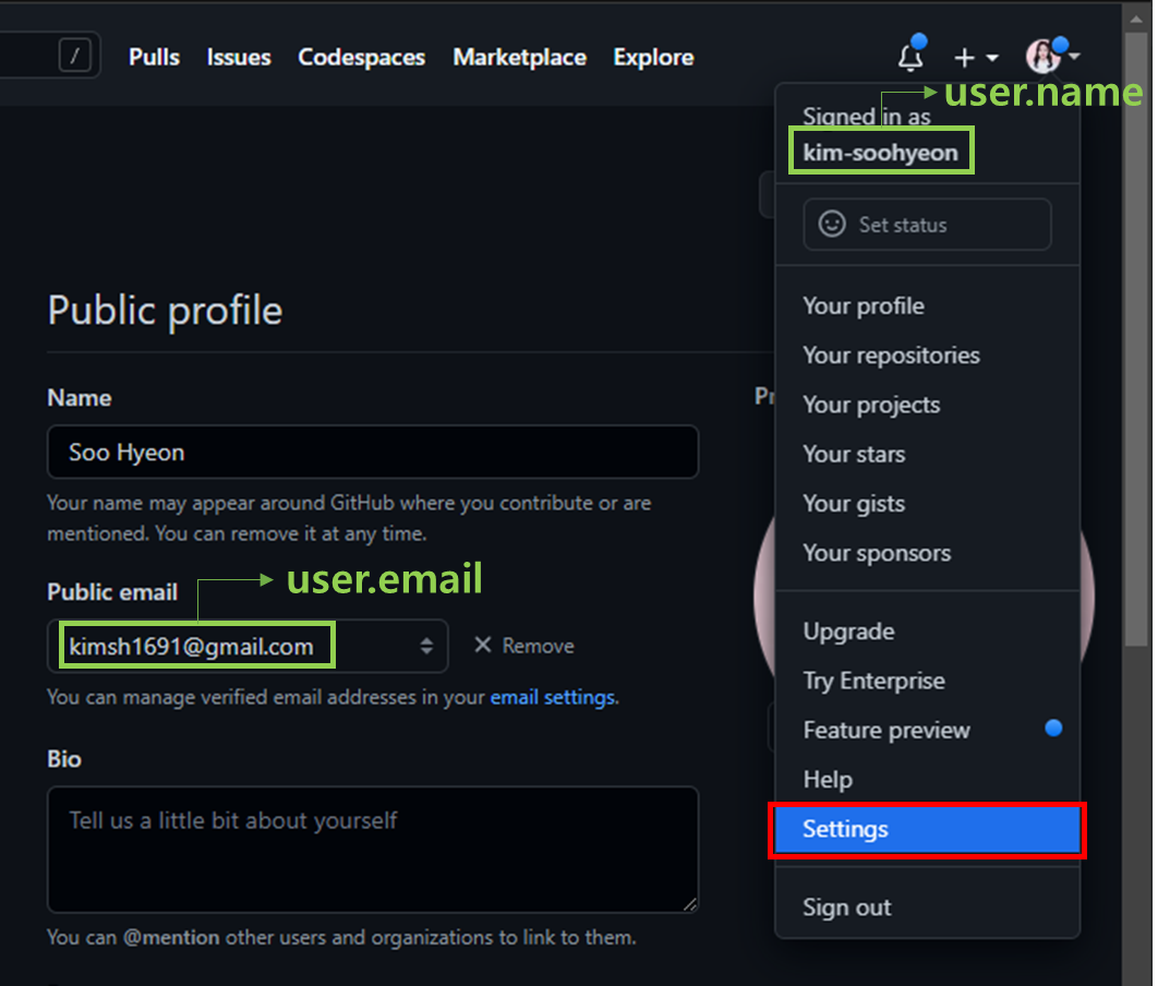 본인의 깃 id와 email을 모르는 경우는 아래 Settings에서 확인이 가능합니다.