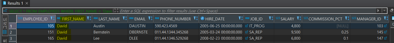 위 테이블에서 FIRST_NAME이 'David'인 데이터들을 구하는 SELECT 문입니다.