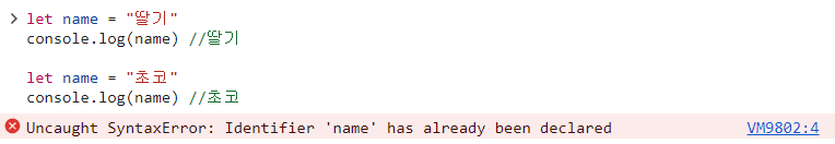let은 중복 선언은 불가하고 변수의 재할당은 가능합니다.