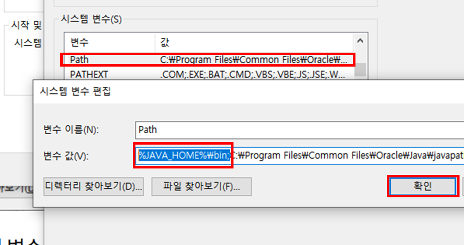 시스템 변수 목록에서 Path 항목을 선택한 후, "편집" 버튼을 클릭하여 맨 앞에 항목을 추가합니다.