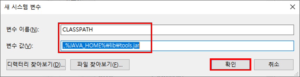 - 변수 값: .,%JAVA_HOME%\lib\tools.jar