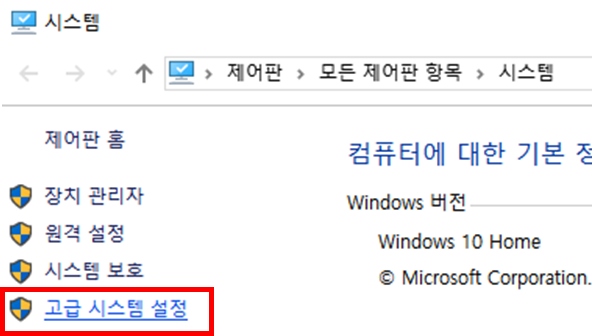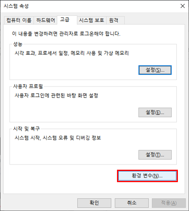 시스템 속성 창이 열리면, 하단의 "환경 변수" 버튼을 클릭합니다.