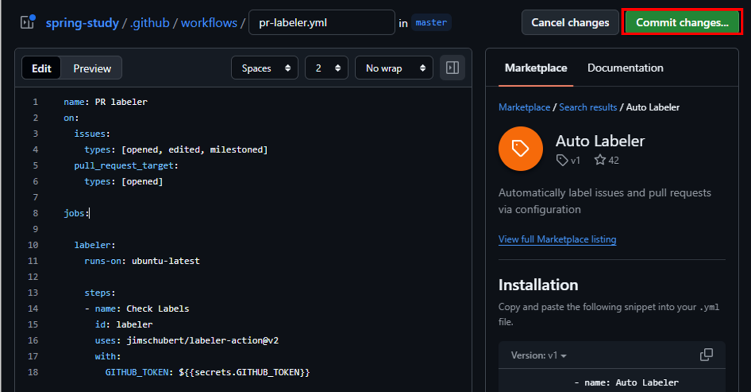 작성한 코드를 저장하고 리포지토리에 커밋하면 GitHub Actions에 워크플로우가 등록됩니다.