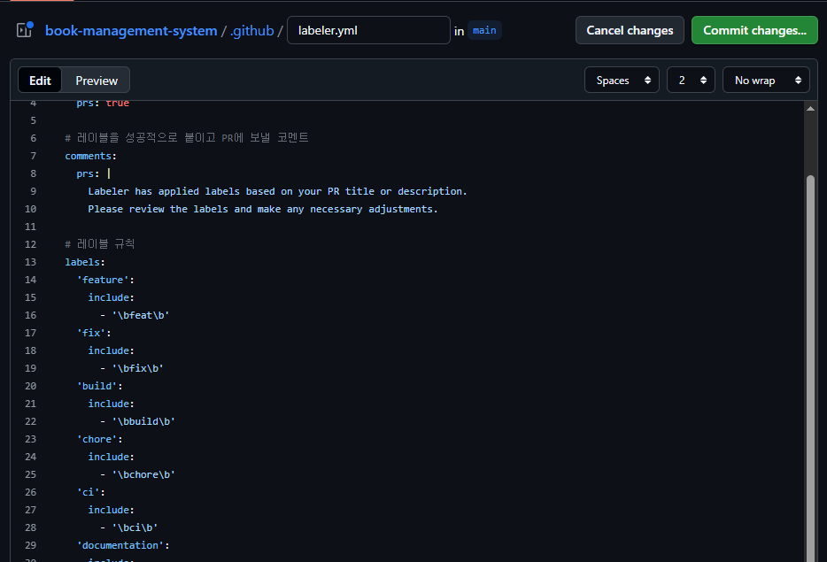 jimschubert/labeler-action 은 .github/labeler.yml 파일을 기준으로 레이블을 설정합니다.