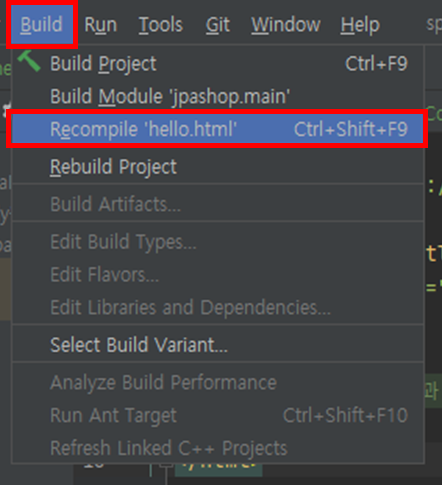 2. 상단 메뉴에서 Build -> Recompile '파일명.html'을 클릭합니다. (단축키: Ctrl + Shift + F9)