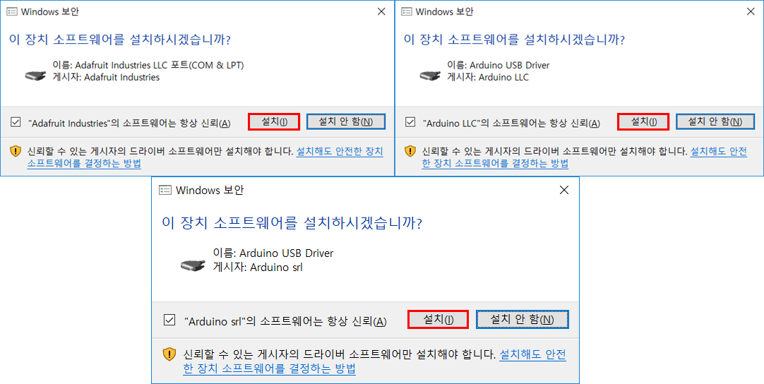 설치 도중 아래와 같은 화면이 나온다면 아두이노 연결을 위해 필요하므로 설치 버튼을 클릭해주세요.