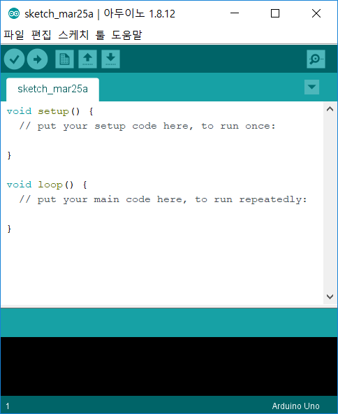 실행하면 아래와 같이 setup, loop가 설정되어 있는 코드가 나옵니다.