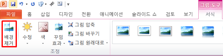 4. 그림을 클릭한 상태에서 서식 > 배경제거를 클릭합니다.