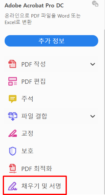 그 다음 우측 메뉴에서 채우기 및 서명을 클릭합니다.