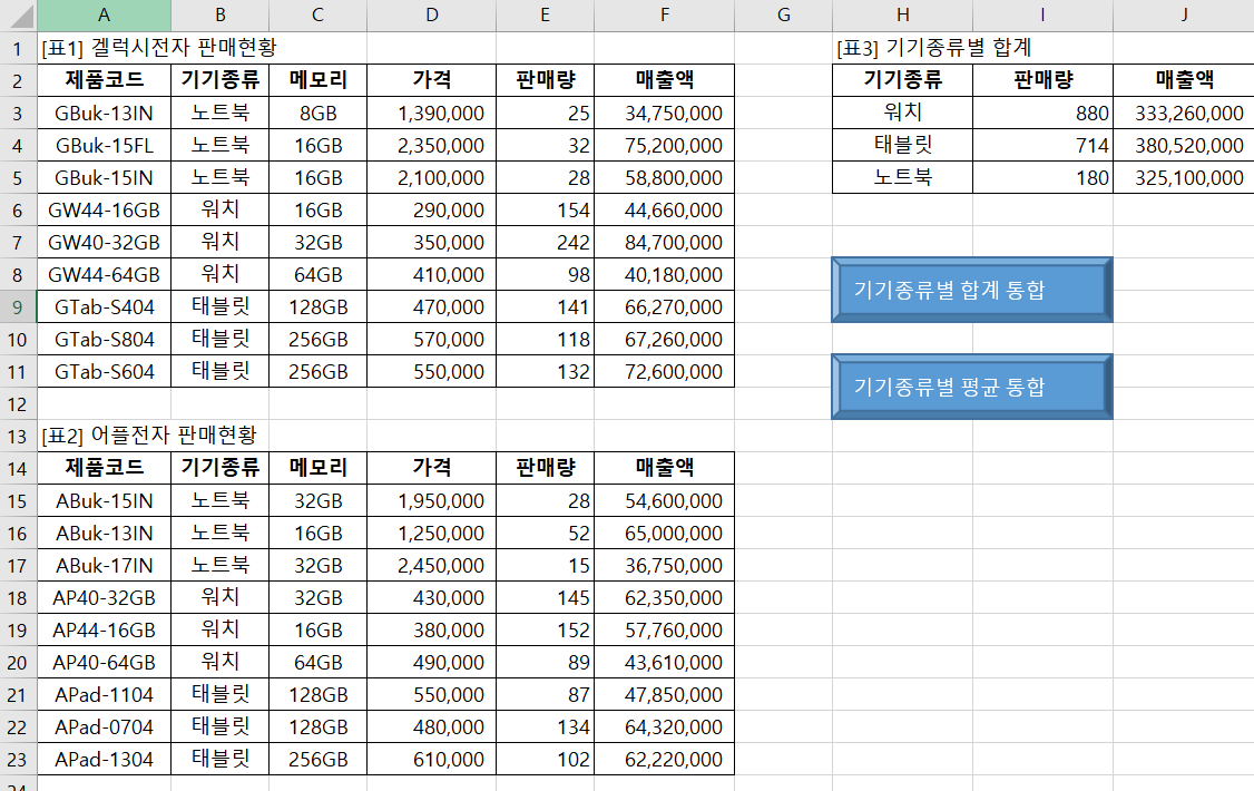 기기종류별 합계 통합, 기기종류별 평균 통합 도형을 클릭하면,