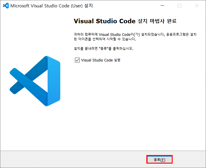 - 설치가 완료되면 종료 버튼을 누릅니다!