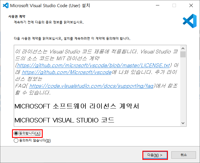 - 라이센스에 동의합니다를 누르고 다음버튼 클릭!
