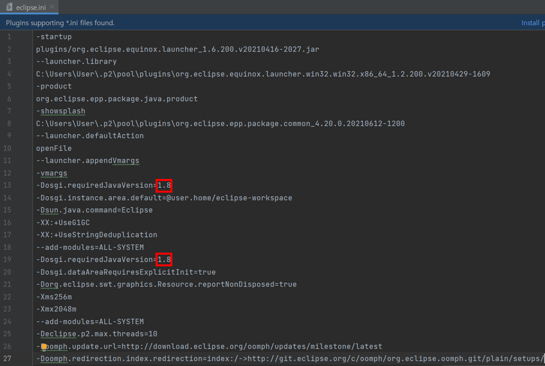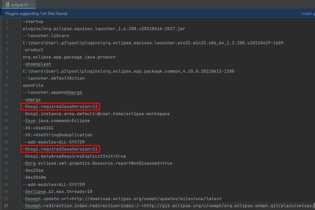 - Dosgi.requiredJavaVersion 버전이 11로 되어 있음을 알 수 있습니다.