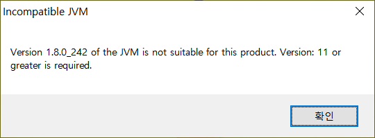 번역해보니, JVM 버전 1.8.0_242가 이 제품에 적합하지 않습니다. 버전: 11 이상이 필요하다는 것이었습니다.
