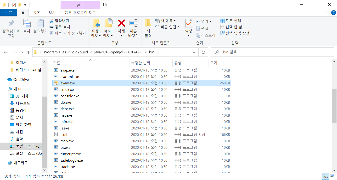 (저의 경우엔, C:\Program Files\ojdkbuild\java-1.8.0-openjdk-1.8.0.242-1\bin\javaw.exe)