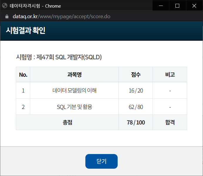 제 47회 SQLD 시험을 합격하였습니다!